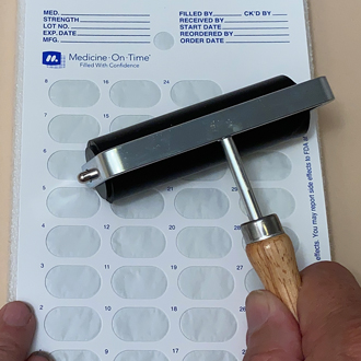 Fold the sealing surface to cover the filled blister. Apply even pressure to seal the medication package, (a hand roller is recommended).