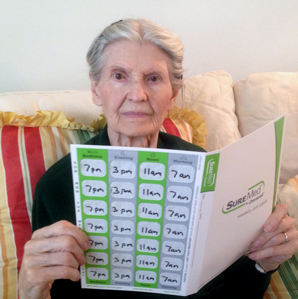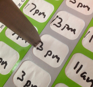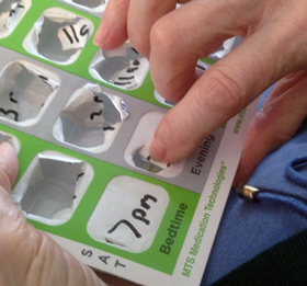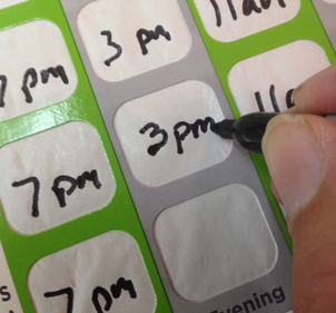 Using a black marker I write in large letters the times on each blister when that medication should be taken during the day. The card sits on her coffee table all day and is a constant reminder of when to take her medications especially when no one else is at home.