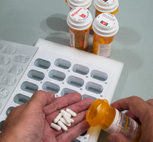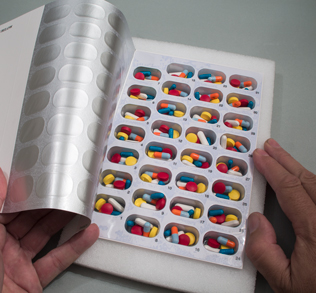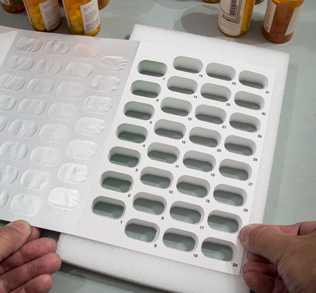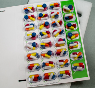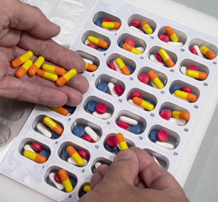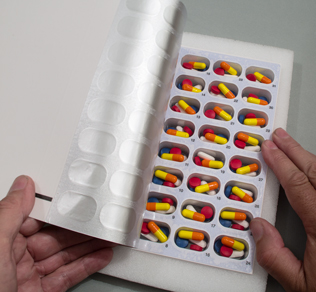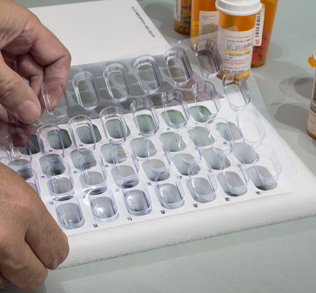 Next to add your five morning medications, place one of each of your five medications into each of the 31 blisters, so you'll end up with five different medications in each blister.