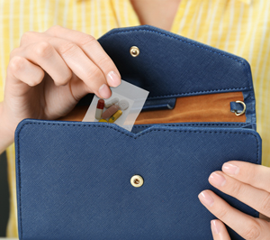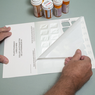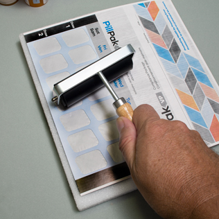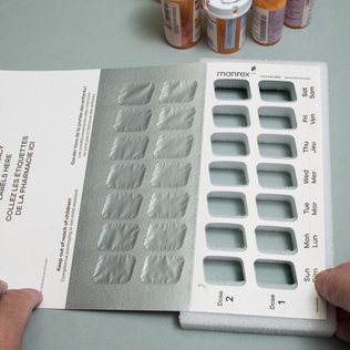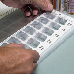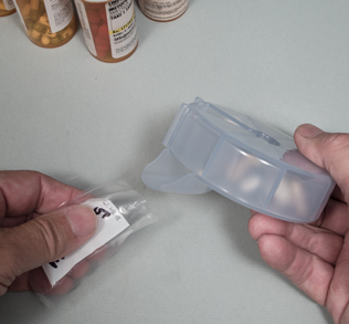 Snap on the filling tray lid and rotate the chute to the first slot of medications. Pick up one of your morning pouches, rub it between your thumb and your forefinger and the pouch will open.