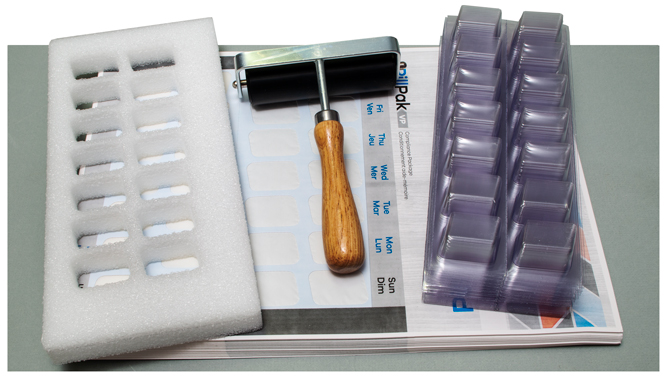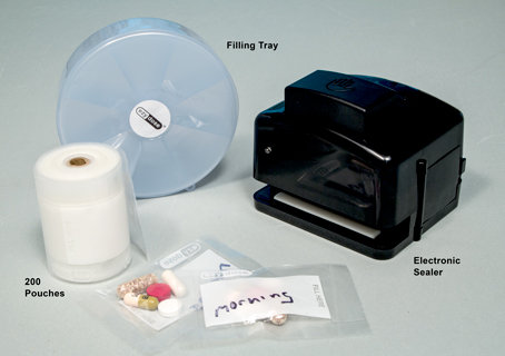 This kit makes it easy to quickly fill these medication pouches, the kit comes with an electronic sealer, a filling tray and a roll of 200 pouches. Click To Order