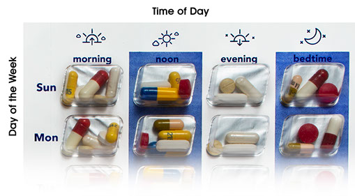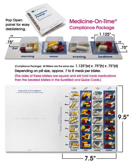 This MOT 7-Day Compliance Package will help you organize all of your medications for a specific day and time in one blister. That way on Sunday morning you’ll look for the column labeled “Morning” and find the row labeled Sunday” to find your correct medication for that day and time. If you need to take multiple medications at the same time but at different times of the day, then this is the perfect medication multi-med package for you.