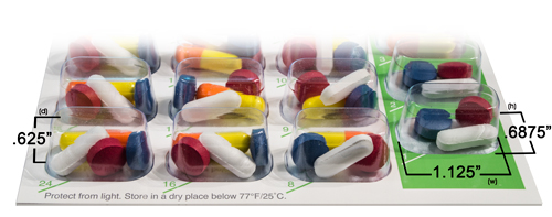 (Sure-Med) All blisters are the same size. 1.125"(w) x .6875"(h) x .625"(d) Depending on pill size, approx. 6 meds per blister.